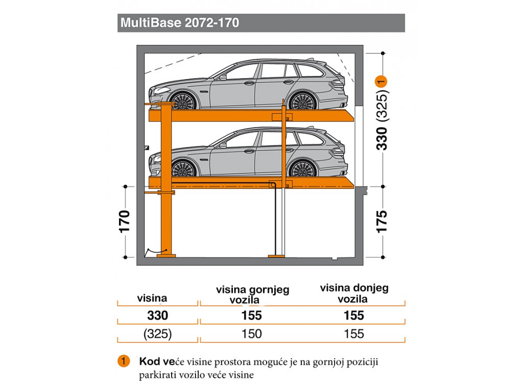 MultiBase 2072i omogućava parkiranje vozila visine 150cm-215cm. Budući omogućava promjenu razmaka platformi svakih 5,0 cm time omogućava i uštedu prostora.
